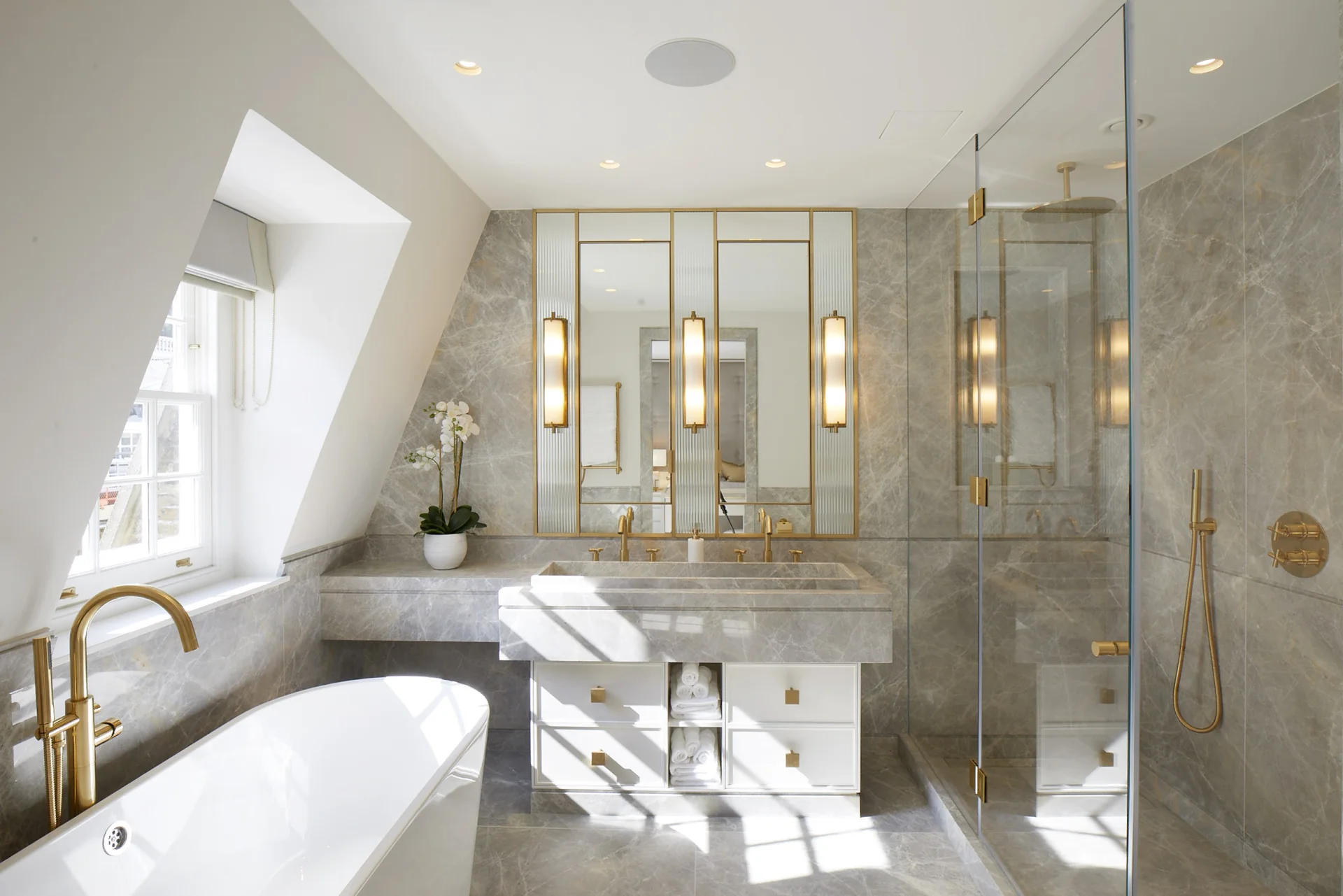 Modern bathroom featuring a dark marble countertop, elegant fixtures, and a potted orchid in a decorative planter.